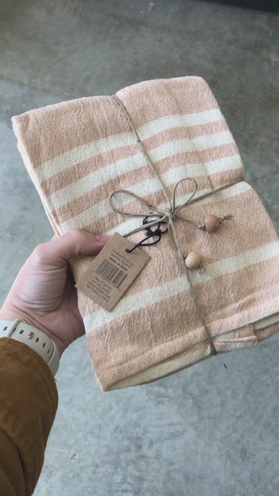 Colorful and casual cotton double cloth tea towels with a striped pattern in 2 hues, tied with a jute and wood bead tie. Suitable for any living or dining space, from farmhouse to lodge. Machine washable and made from cotton.
