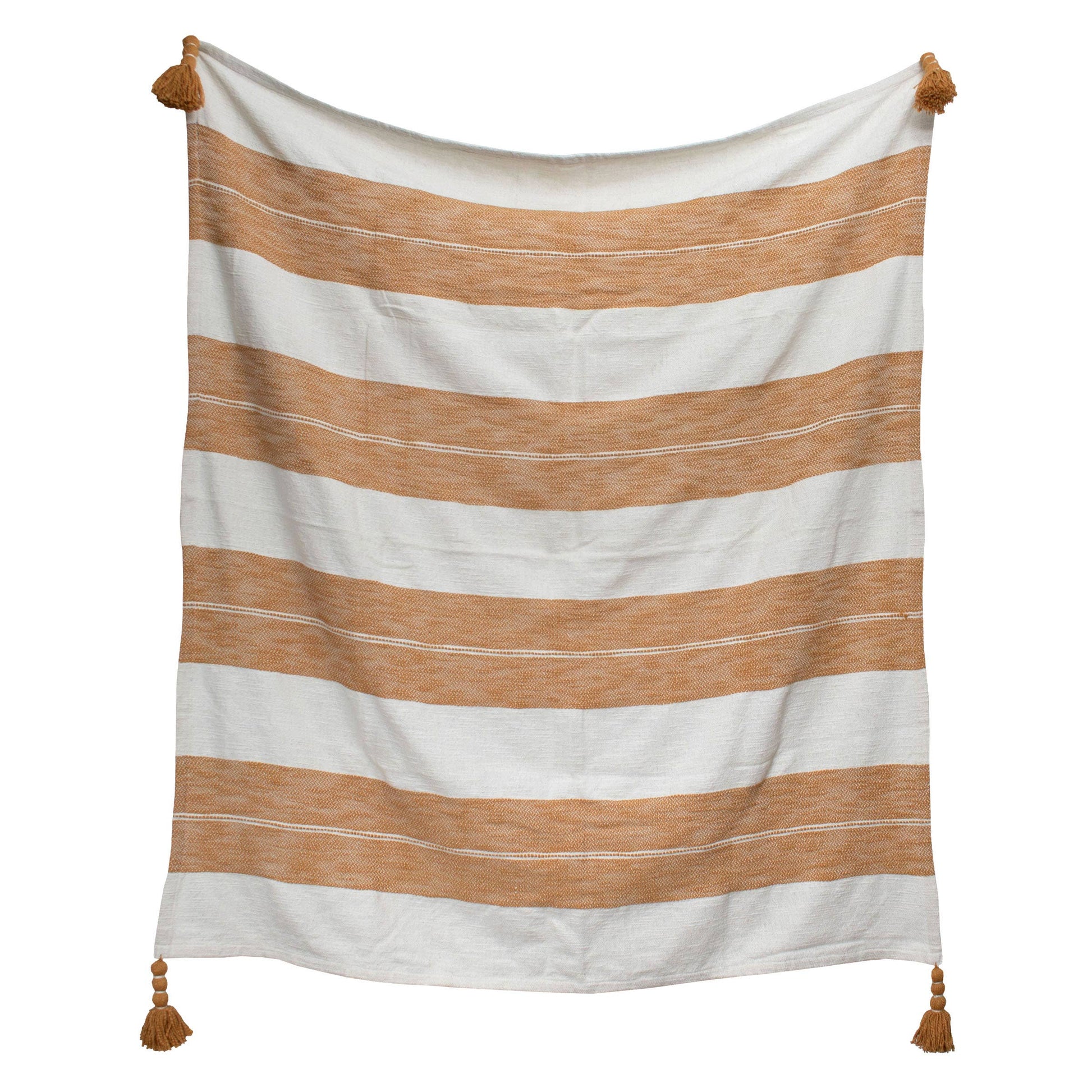 JoEllen Ochre Striped Cotton Throw Blanket | Tasseled, 50x60